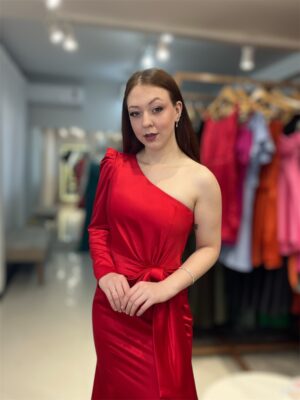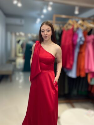 Vestido Um Ombro Só com Laço Removível e Bolsos