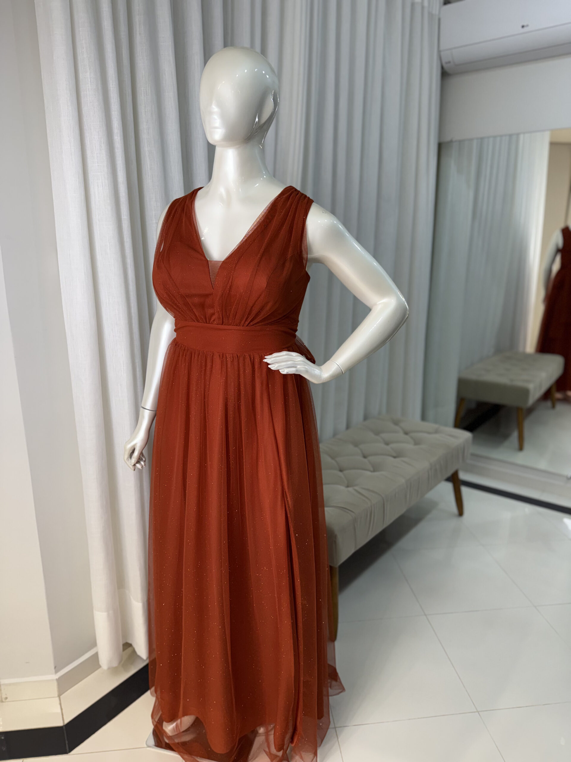 Vestido Tule com Paetês, Fenda e Alças de Laço