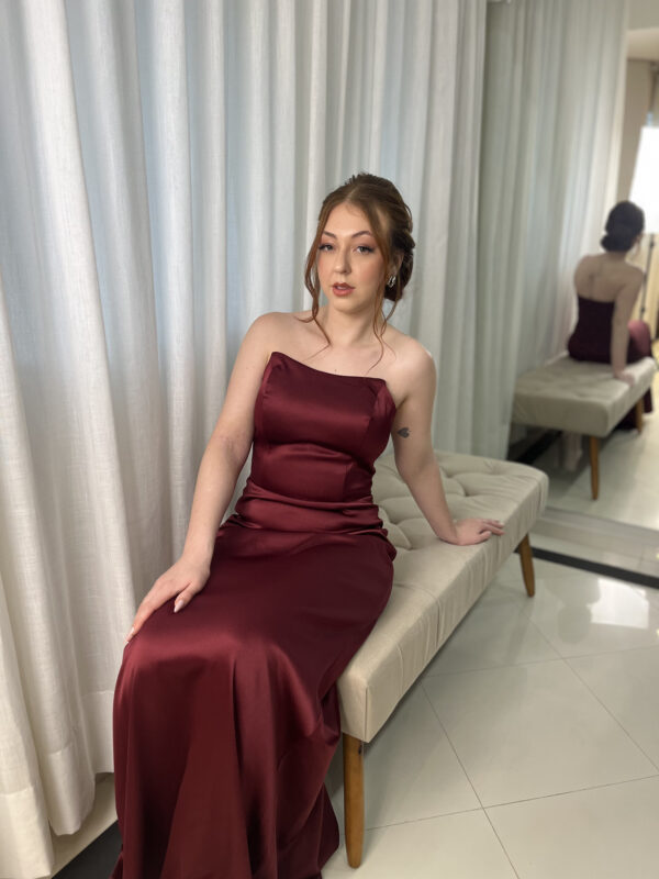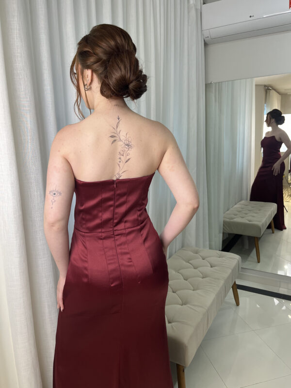 Vestido tomara que caia em modelagem sereia – possui capa avulsa de uso opcional – Marsala G – Uva P