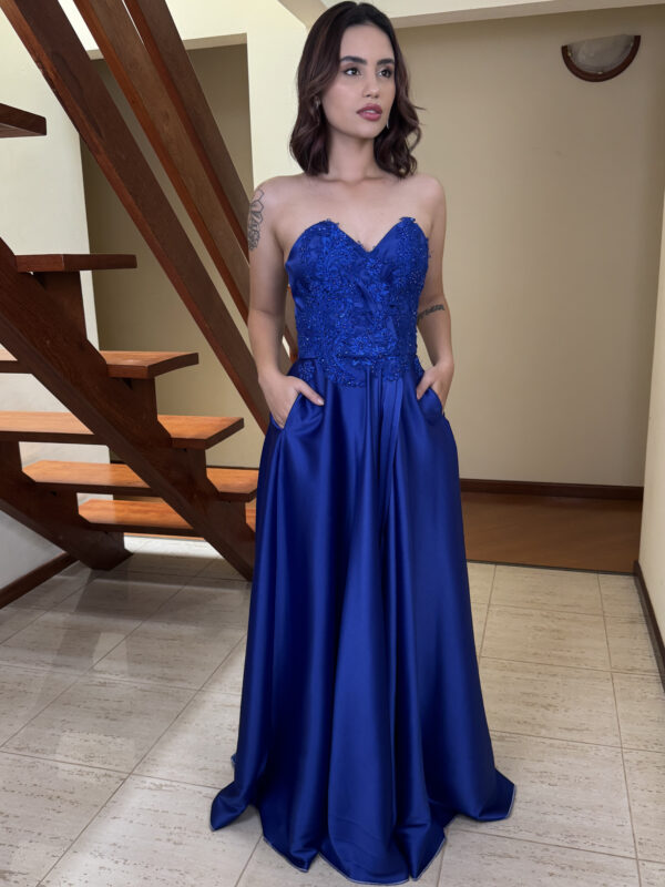 Modelo tomara que caia em alfaiataria estruturada, com bordado delicado e bolsos laterais.