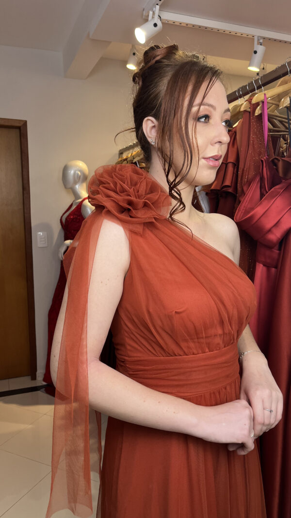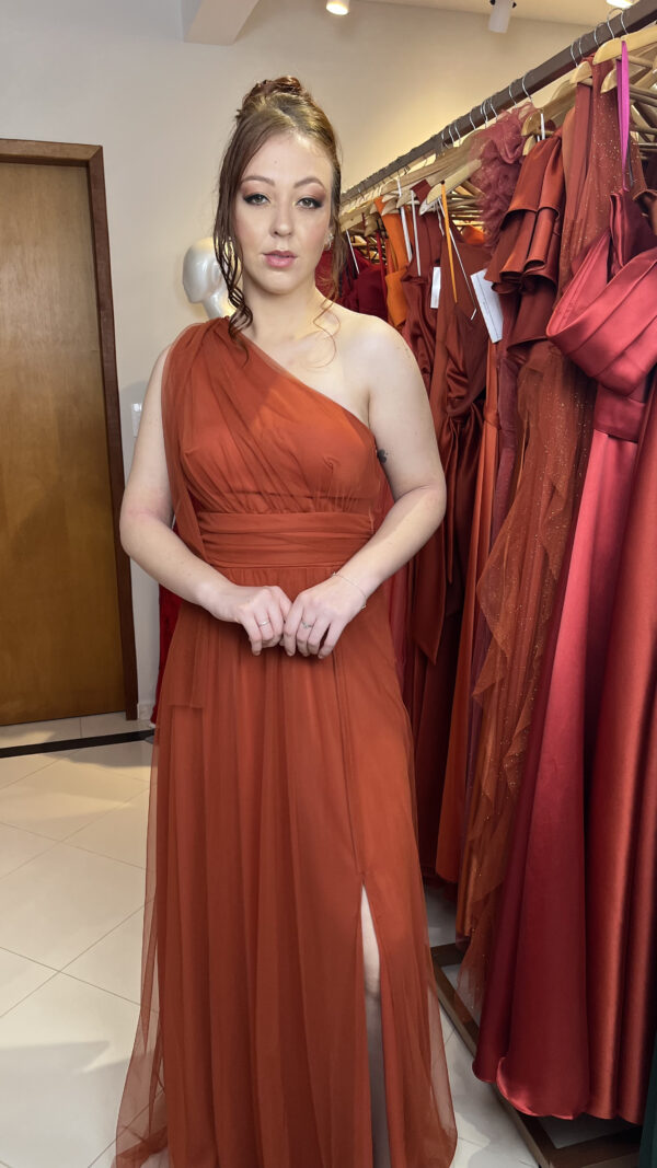 Vestido longo em tule com um ombro só, cintura marcada e fenda frontal. A flor aplicada é removível e pode ser reposicionada conforme desejado.