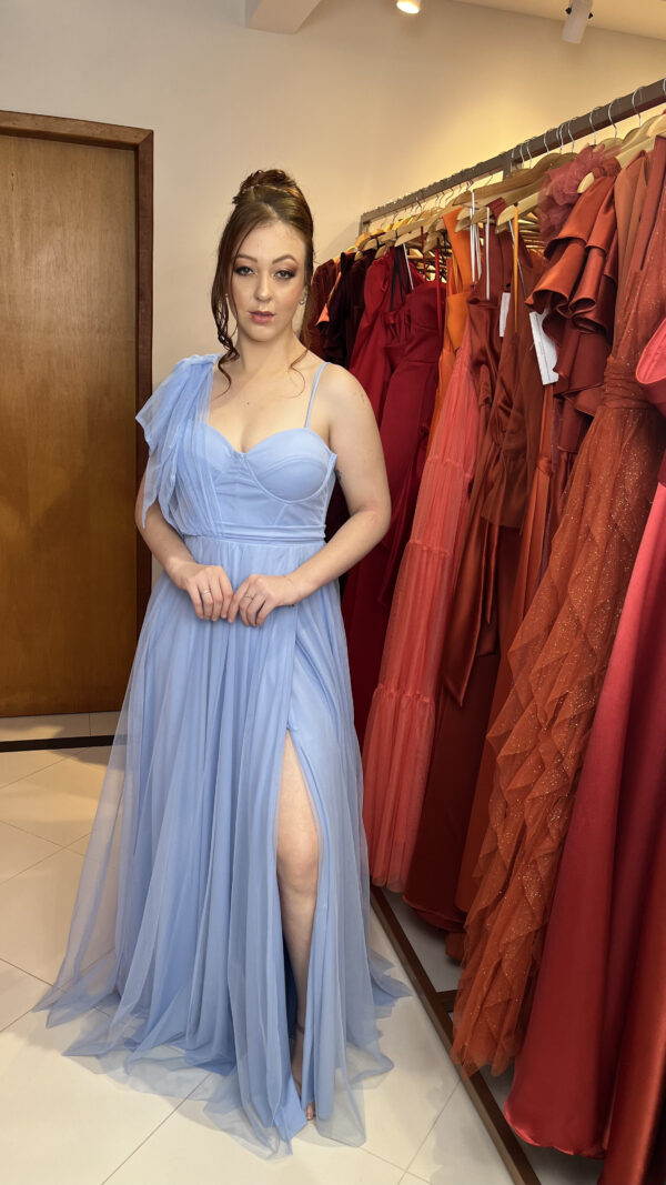 Vestido longo em tule leve com forro, decote coração com alças finas, detalhe de laço estruturado em um ombro e cintura marcada. Saia fluida com camadas.