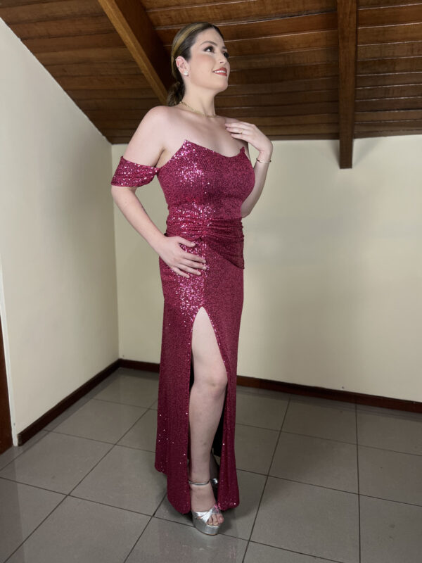 Modelo com paetês por toda a peça, ombro a ombro com mangas caídas, fenda lateral e drapeado na cintura.