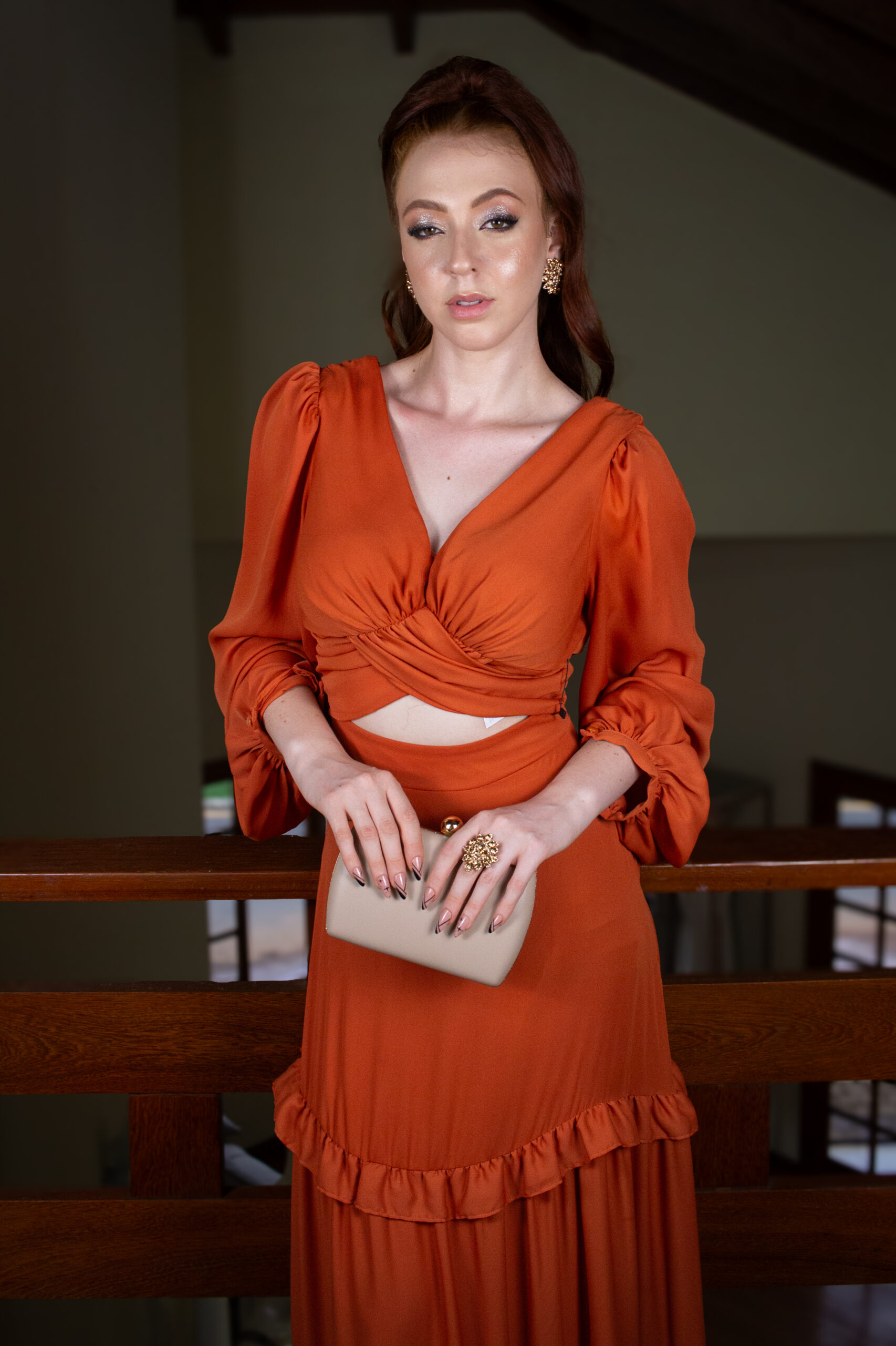 Modelo laranja em crepe, tamanho M, decote V, mangas longas bufantes e recorte frontal na cintura.
