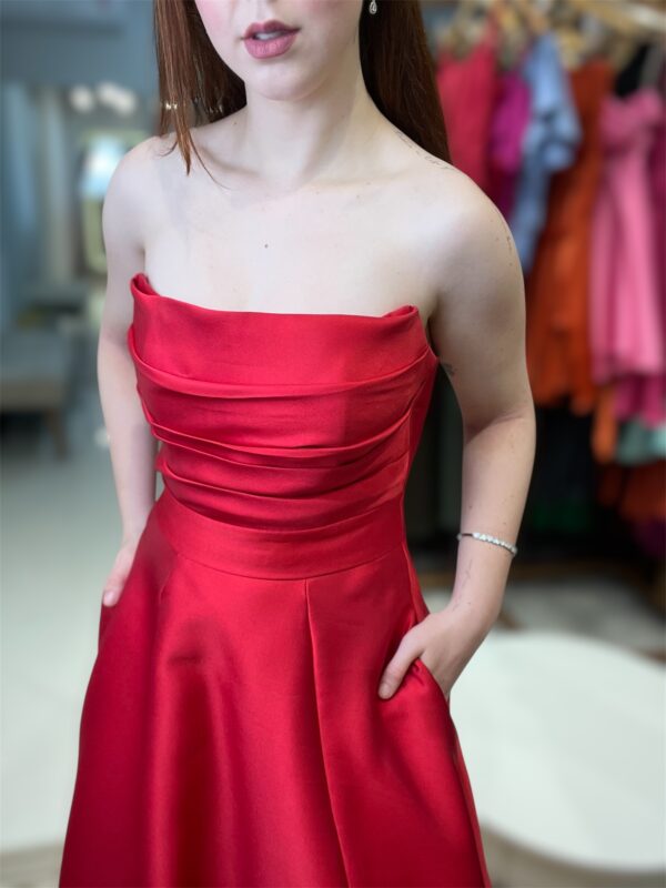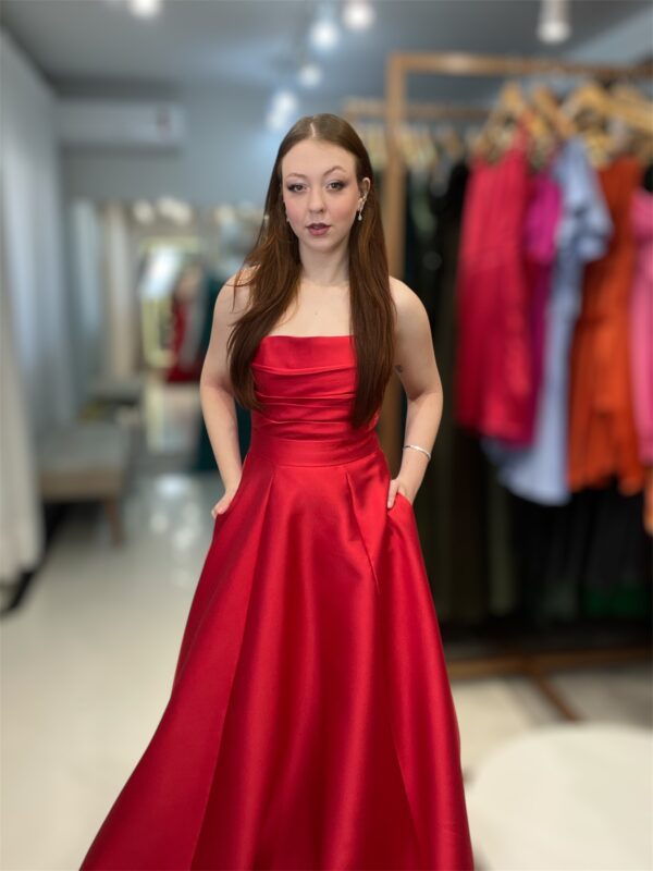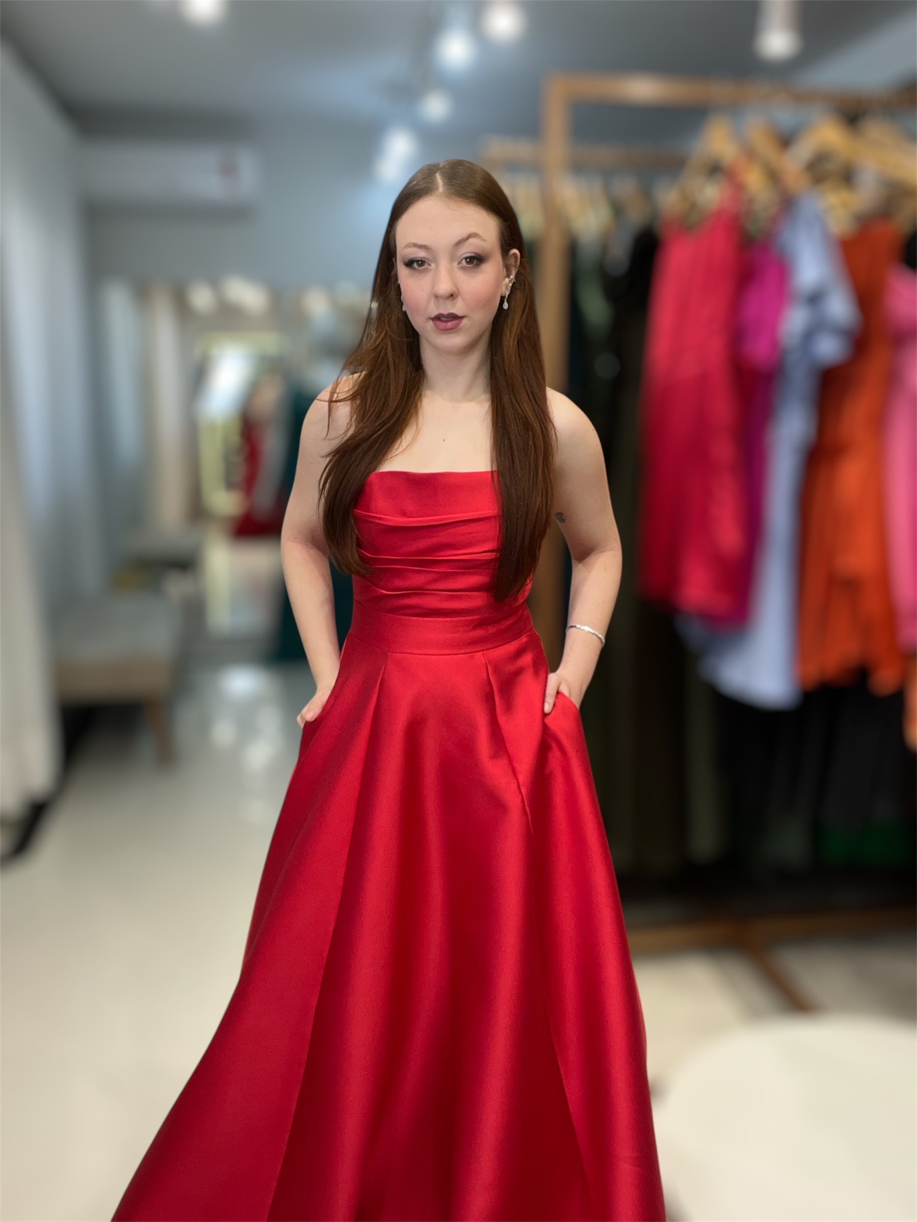 Vestido vermelho em alfaiataria lisa, modelagem evasê com bolsos laterais e detalhe drapeado no busto. Disponível no tamanho M.
