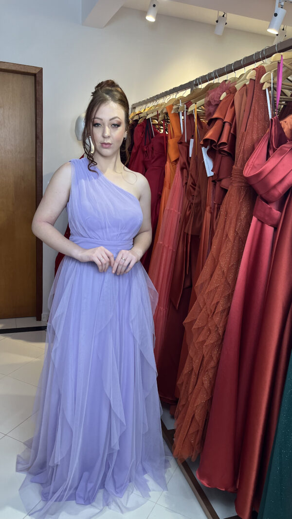 Modelo em tule com alça única, cintura drapeada e saia fluida com camadas.