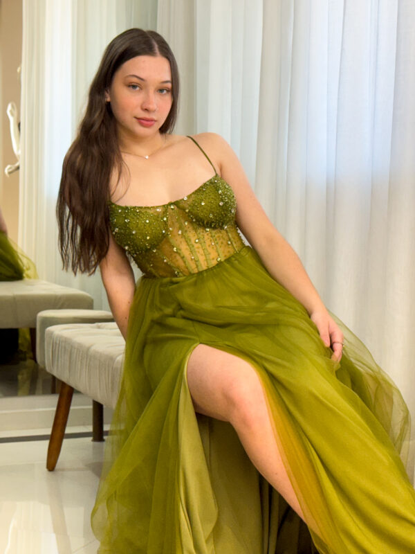 O corpo do vestido apresenta uma sutil transparência, adornada com delicados bordados que acrescentam um toque de glamour e romance ao seu visual. A tonalidade verde oliva confere uma sensação de serenidade e sofisticação, perfeita para ocasiões especiais.